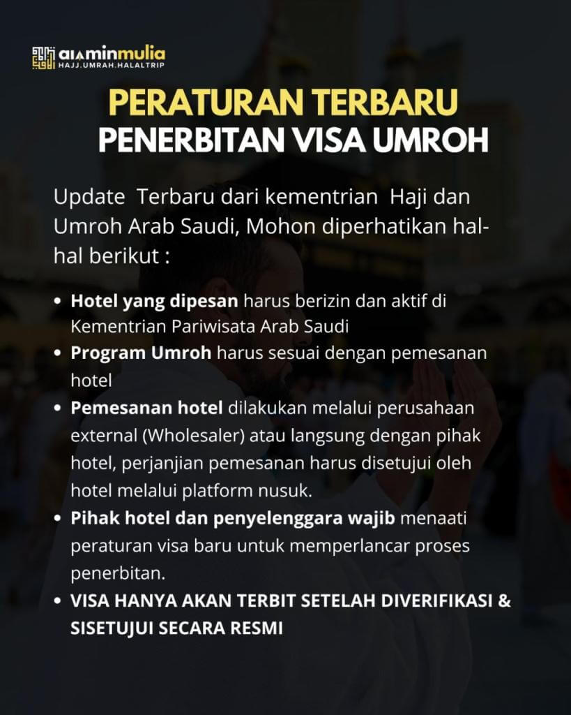 Mulai 10-11 Juni 2025 (14 Dzulhijjah 1446 H.), ada aturan baru Kerajaan Saudi Arabia terkait penerbitan visa umroh. Jangan sampai travel yang kamu pilih belum update info ini, apalagi kamu atau keluargamu sedang merencanakan ibdah umroh dalam waktu dekat.